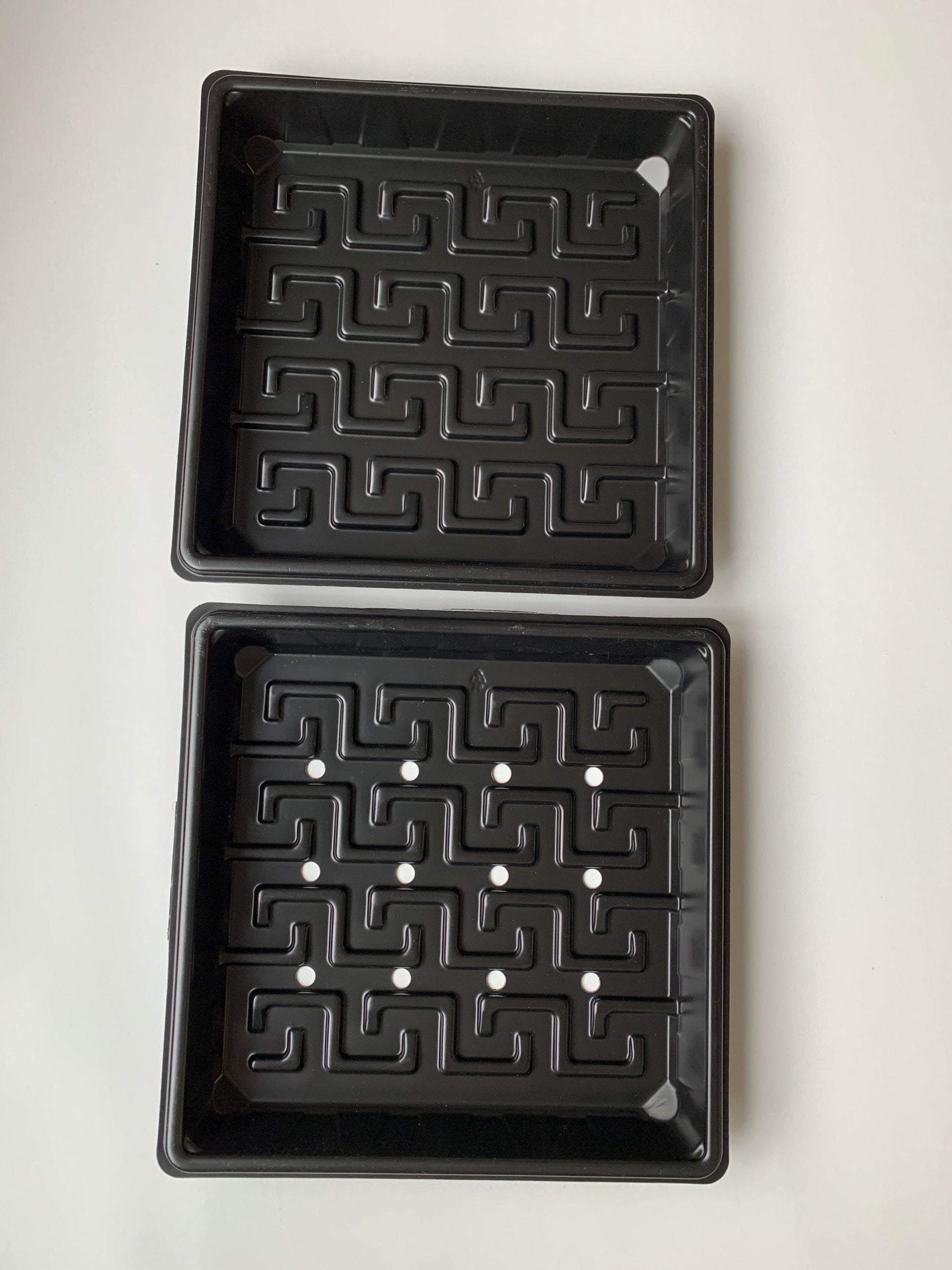 Our microgreen trays fit together, with the tray with holes sitting inside the tray without holes to provide drainage for your microgreens growing in your chosen growing medium.