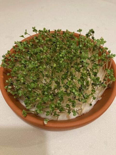 The seeds sprout very quickly. I used a spice jar to spread the seeds on damp soil and mist them with a spray bottle. I covered them with a dome and had them in my greenhouse with grow lights. I had done another trial sowing them in a clay saucer with cotton wool and covering them with a plate for the first few days (like I do with curly cress). After taking away the plate I put them in a sunny spot. They had a bit smaller leaves than the ones under the grow lights, but were just as tasty. Eating them by themselves they are little bit spicy. I enjoy them very much